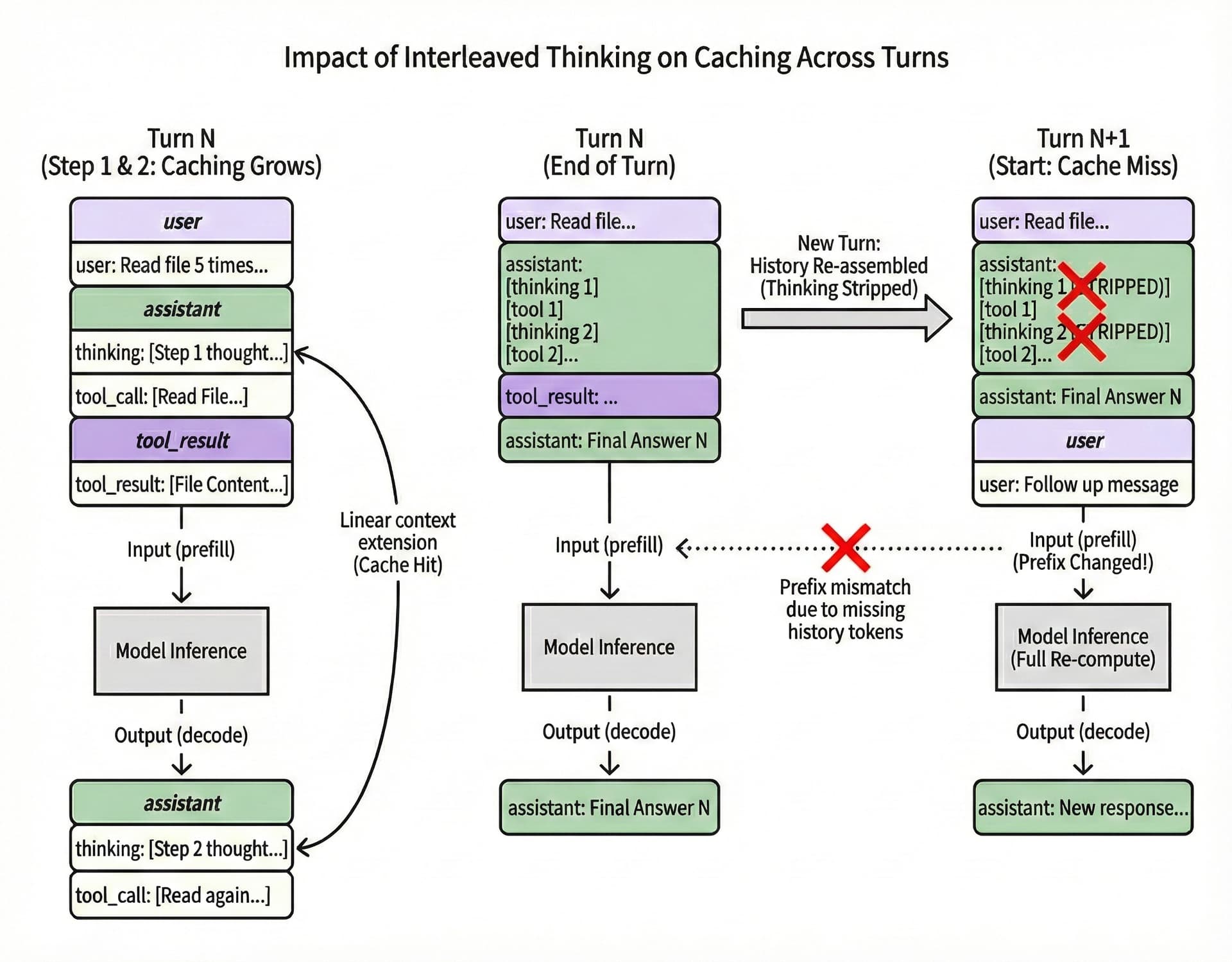 kimi-cli) re-assembles the history. To save tokens or present a cleaner context, the historical thinking blocks from previous turns are usually stripped out.Regarding the Infrastructure and Optimization: