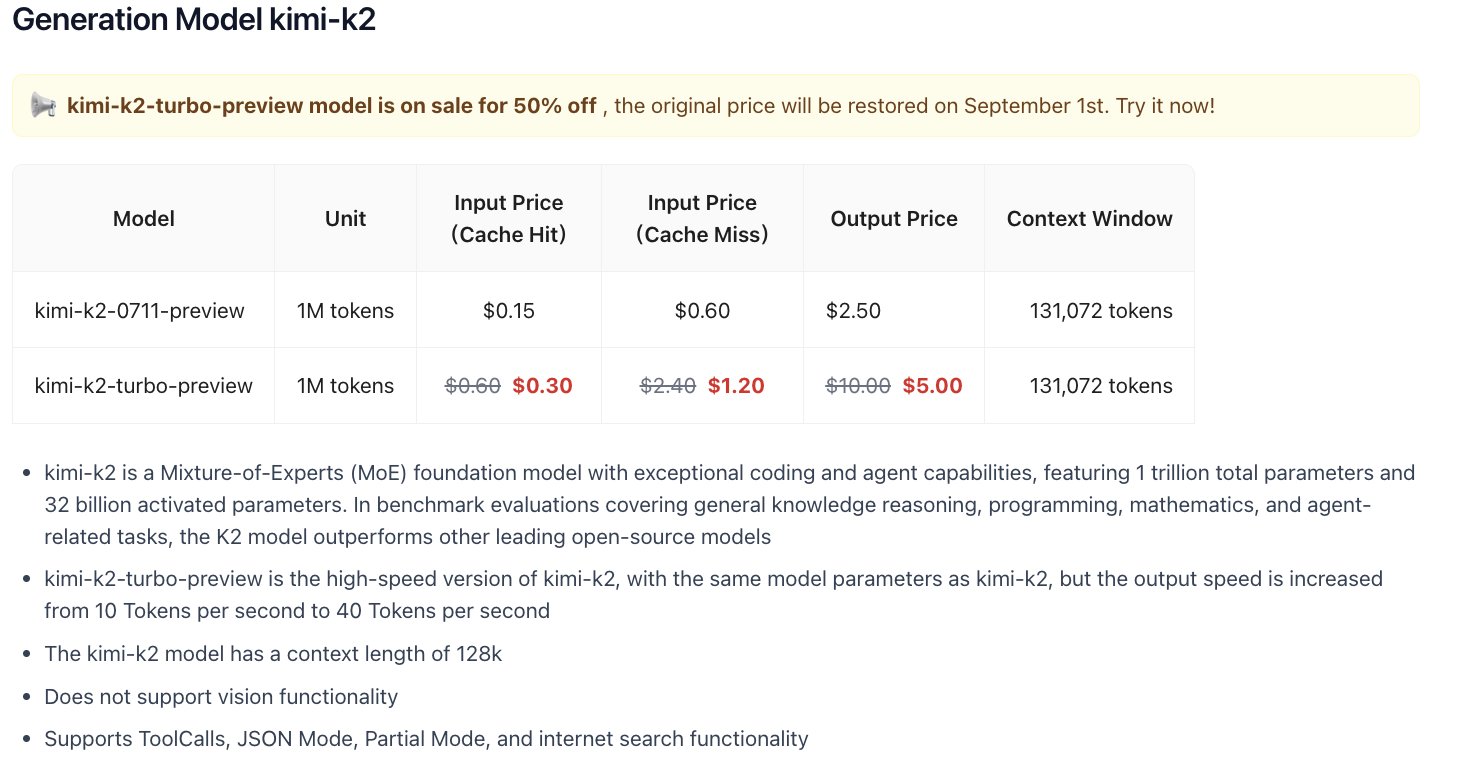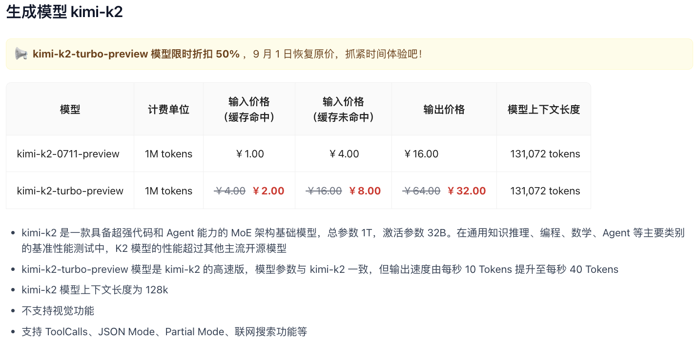 kimi-k2-turbo-preview 是 kimi-k2 的高速版,模型参数与 kimi-k2 一致,但输出速度由每秒 10 Tokens 提升至每秒 40 Tokens。目前限时 5 折特惠,9月1日恢复原价,折扣后的价格:模型每百万 tokens 输入价格(缓存命中)¥2.00,输入价格(缓存未命中)¥8.00,输出价格 ¥32.00。