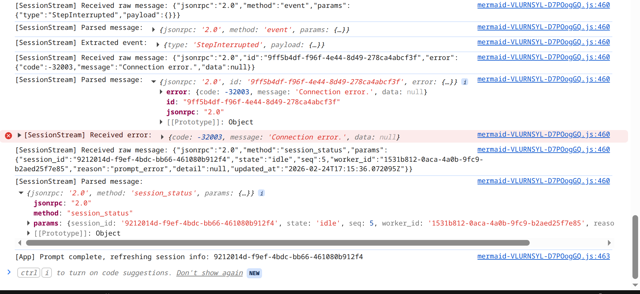 I am in a previous session (or in any new one) and when trying to ask anything i get “LLM provider error: Connection error.“ with red. This happens in the web ui as well. Any thoughts on what can i do? I am attaching the output from the web ui in developer tools (in the terminal kimi i just get the message)