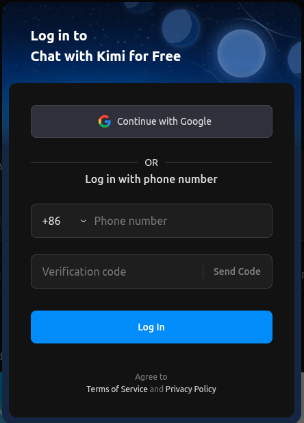 Thanks for the quick response, it happens at kimi.com. kimi.ai automatically redirects me to kimi.com. The Login method I use is SMS authentication. If I click on “Log in” a popup is shown that gives me two options: 1 Use Google 2: use my phone number: