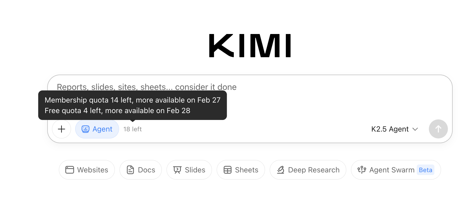 Please note that Agent quota (for Websites, Docs, Sheets, and Agent mode) is calculated separately from Kimi Code quota. If you’re looking for your coding assistant usage limits, those can be viewed in the Kimi Code console at this link. The quota shown in the main Kimi interface only applies to Agent features.